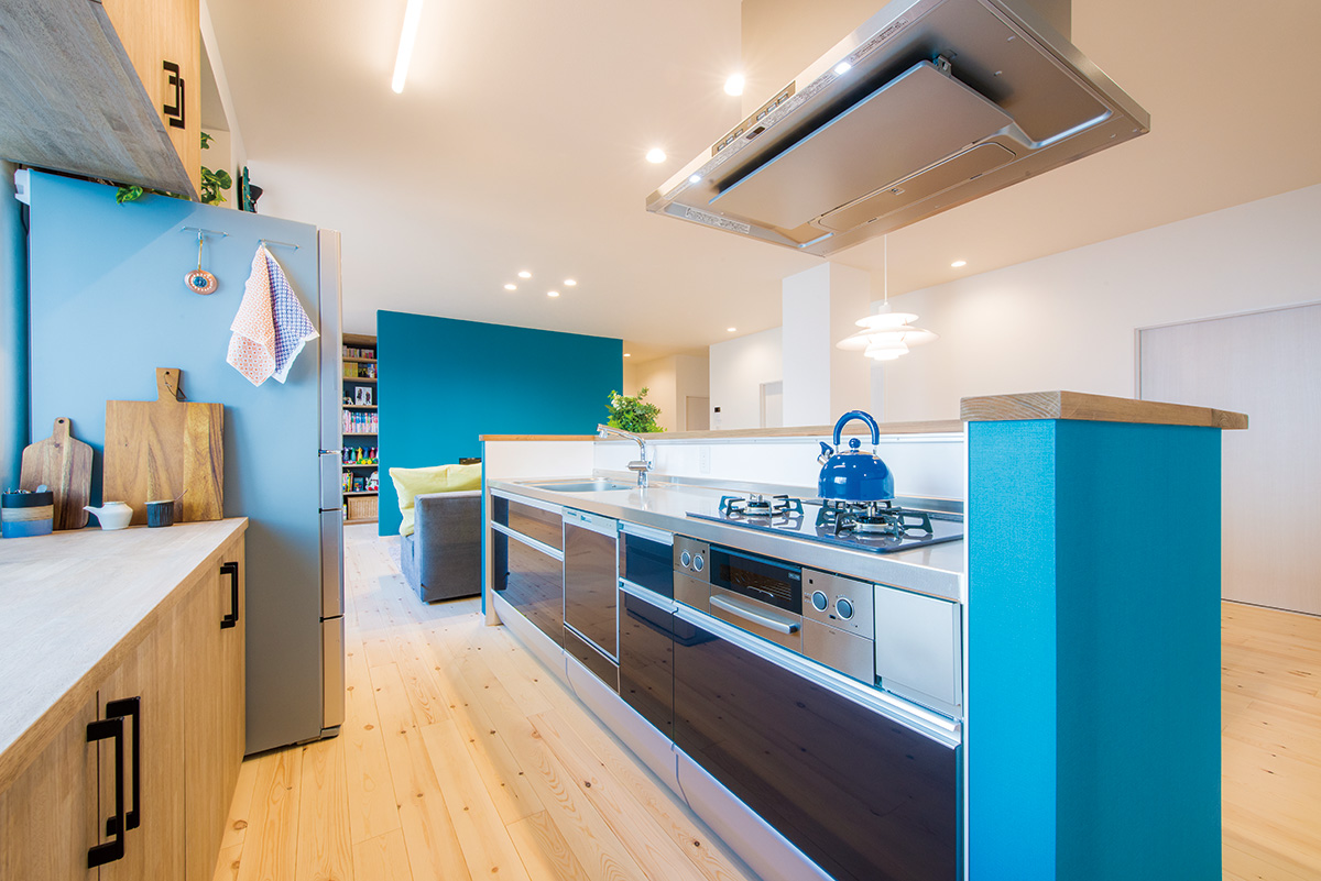 こちらは、築43年のマンションの壁付けキッチンを思い切ってアイランド型に変更した、リノベーション事例です。リノベーションの際にリビングに取り入れた鮮やかなブルーを、キッチンカウンターにも採用。キッチンの背後には造作棚を設置し、利便性も叶えています。
