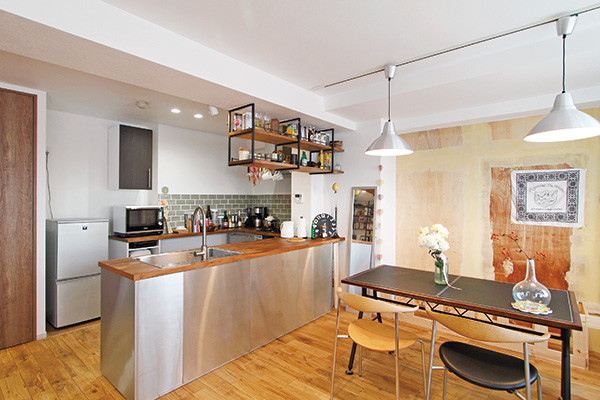 キッチンの壁を無くし、おしゃれなオープン型のコの字キッチンに仕上げることも可能です。こちらの築21年のマンションのリノベーション事例では、施工主自らチョイスしたイケアのキッチンを設置。メタリック素材がおしゃれなキッチンに合わせ、キッチン上部に造作棚をデザインしています。