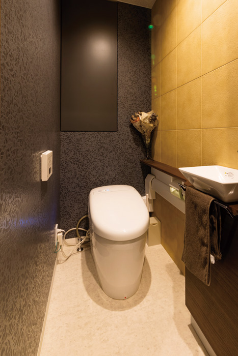 まるでホテルのレストルームのような高級感があるこちらのトイレ。ご夫婦と子ども2人の家族構成で、築年数約20年のマンションのトイレをリノベーションした事例です。ベースは黒でシックな雰囲気を演出しつつ、一面のみをタイル調にしてクールなアクセントをプラスしています。リノベーション費用は約50万円、工事期間は3日間です。