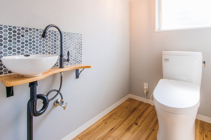 壁の淡いグレーに合わせて施主が探されたクッションフロアを採用。雰囲気にマッチしたアイアン製のペーパーホルダーも施主支給と、こだわりの詰まったトイレになっています。